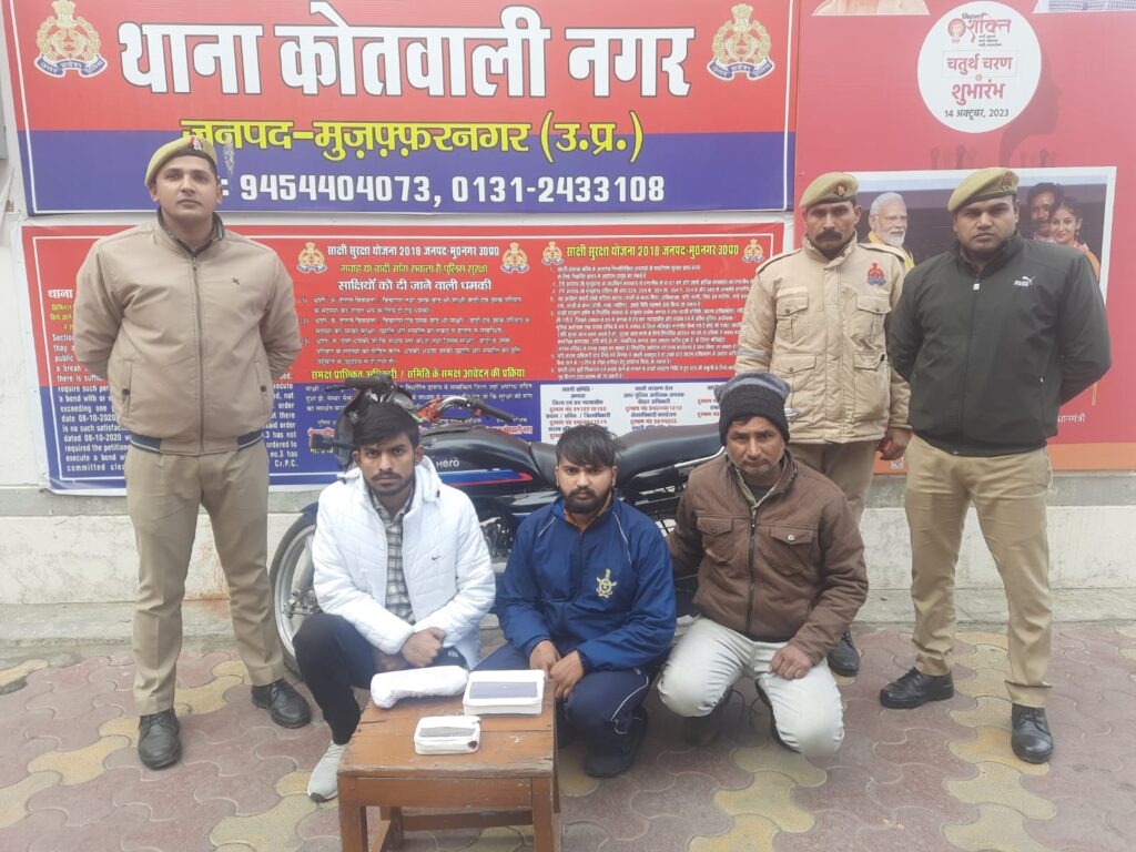 श्रीमान वरिष्ठ पुलिस अधीक्षक महोदय के निर्देशन व श्रीमान पुलिस अधीक्षक नगर महोदय के निकट पर्यवेक्षण मे तथा क्षेत्राधिकारी नगर महोदय के नेतृत्व में जनपद में शातिर,वांछित व लूटेरे किस्म के अभियुक्तगणो के विरूद्ध चलाये जा रहे अभियान के दौरान दिनांक 03.01.2024 को समय 10.30 बजे थाना कोतवाली नगर पुलिस टीम के द्वारा न्याजुपुरा काली नदी वाले रास्ते पर छप्पर वाली मस्जिद के पास थाना कोतवाली नगर मु0नगर से तीन शातिर किस्म के वांछित लूटेरो अभियुक्तगणो 1. दीपक खत्री पुत्र ऋषिपाल निवासी म0न0 155 प्रेमपुरी थाना कोतवाली नगर जनपद मु0नगर उम्र 24 वर्ष 2. अंशुल कश्यप पुत्र संजीव निवासी मौहल्ला गऊशाला थाना कोतवाली नगर जनपद मुजफ्फरनगर उम्र करीब 23 वर्ष 3.सोनू चूग पुत्र जगदीश लाल निवासी रामलीला टिल्ला थाना कोतवाली नगर मु0नगर उम्र करीब 42 वर्ष को लुटे गए एक बैग जिसमे लूट का एक मोबाईल फोन सैमसंग ए-50 रंग नीला व एक मोबाईल फोन लावा किपेड व 650 रूपये, आधार कार्ड व घटना में प्रयुक्त एक मोटर साईकिल स्पलैण्डर रंग काला सम्बन्धित मु0अ0सं0 003/2024 धारा 392/411/120-बी भा0द0वि0 थाना कोतवाली नगर जनपद मु0नगर में गिरफ्तार किया गया । अभि0गण के आपराधिक इतिहास की जानकारी की जा रही है । अभियुक्तगणो को समय से माँ0 न्यायालय पेश किया जायेगा I