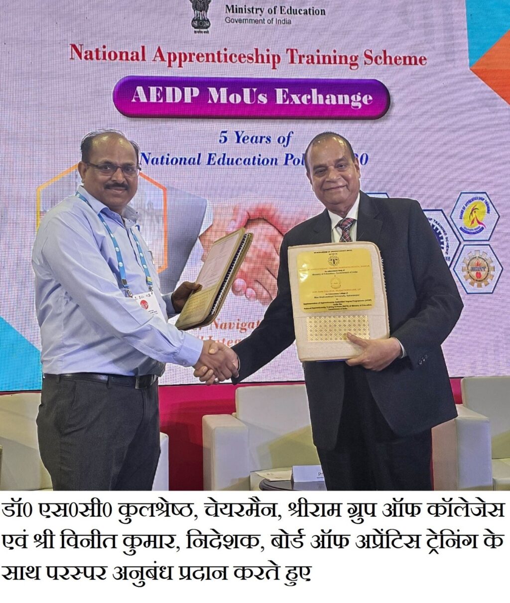 दिनांक 29.07.2025 को राष्ट्रीय शिक्षा नीति ;NEP-2020 पंाचवी वर्षगांठ पर भारत मण्डपम, नई दिल्ली में अखिल भारतीय शिक्षा समागम 2025 कार्यक्रम आयोजित हुआ। जिसके मुख्य अतिथि श्री धर्मेन्द्र प्रधान, कैबिनेट शिक्षा मंत्री, भारत सरकार, विशिष्ठ अतिथि श्री जयंत चौधरी, राज्यमंत्री (स्वतन्त्र प्रभार), तकनीकी एवं कौशल विकास, भारत सरकार एवं कई राज्यों के शिक्षामंत्री उपस्थित रहे। इस अवसर पर भारत सरकार की राष्ट्रीय अप्रेंटिसशिप ट्रेनिंग स्कीम के अन्तर्गत श्रीराम कॉलेज एवं बोर्ड ऑफ अप्रेंटिसशिप ट्रेनिंग, भारत सरकार के बीच एक अनुबन्ध हुआ। इस अनुबन्ध में श्रीराम कॉलेज की ओर से चेयरमेंन, डॉ. एस. सी. कुलश्रेष्ठ एवं बोर्ड ऑफ अप्रेंटिसशिप ट्रेनिंग की ओर से निदेशक, श्री विनीत कुमार ने अनुबन्ध पर हस्ताक्षर किये।